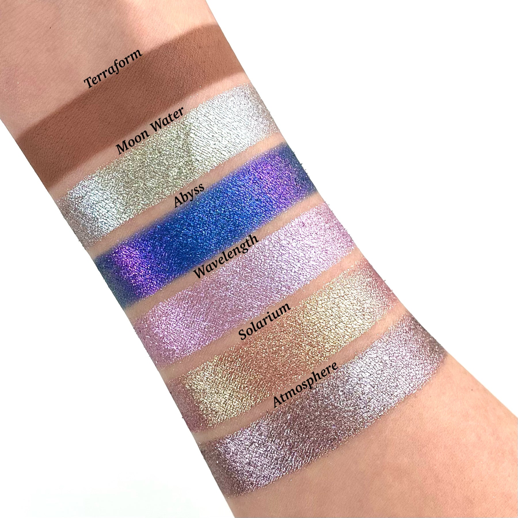 Space Chemistry Singles Bundle features 12 handcrafted singles. A celestial mix of 2 mattes, 4 duochromes, 2 metallic shimmers, and 4 multichromes. Each one is custom blended, vegan, cruelty-free, and packed with pigments that shift and shimmer like stardust.