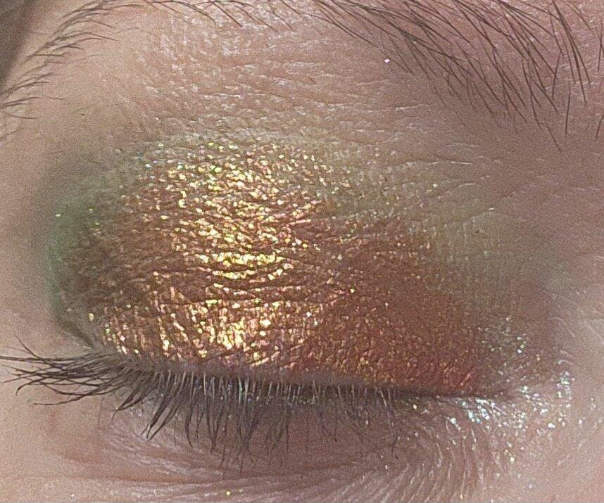 Very pretty burnt orange with gold and green flecks. You can keep it light for daytime or really punch it up for the evening. Shown with green matte and green eyeliner.