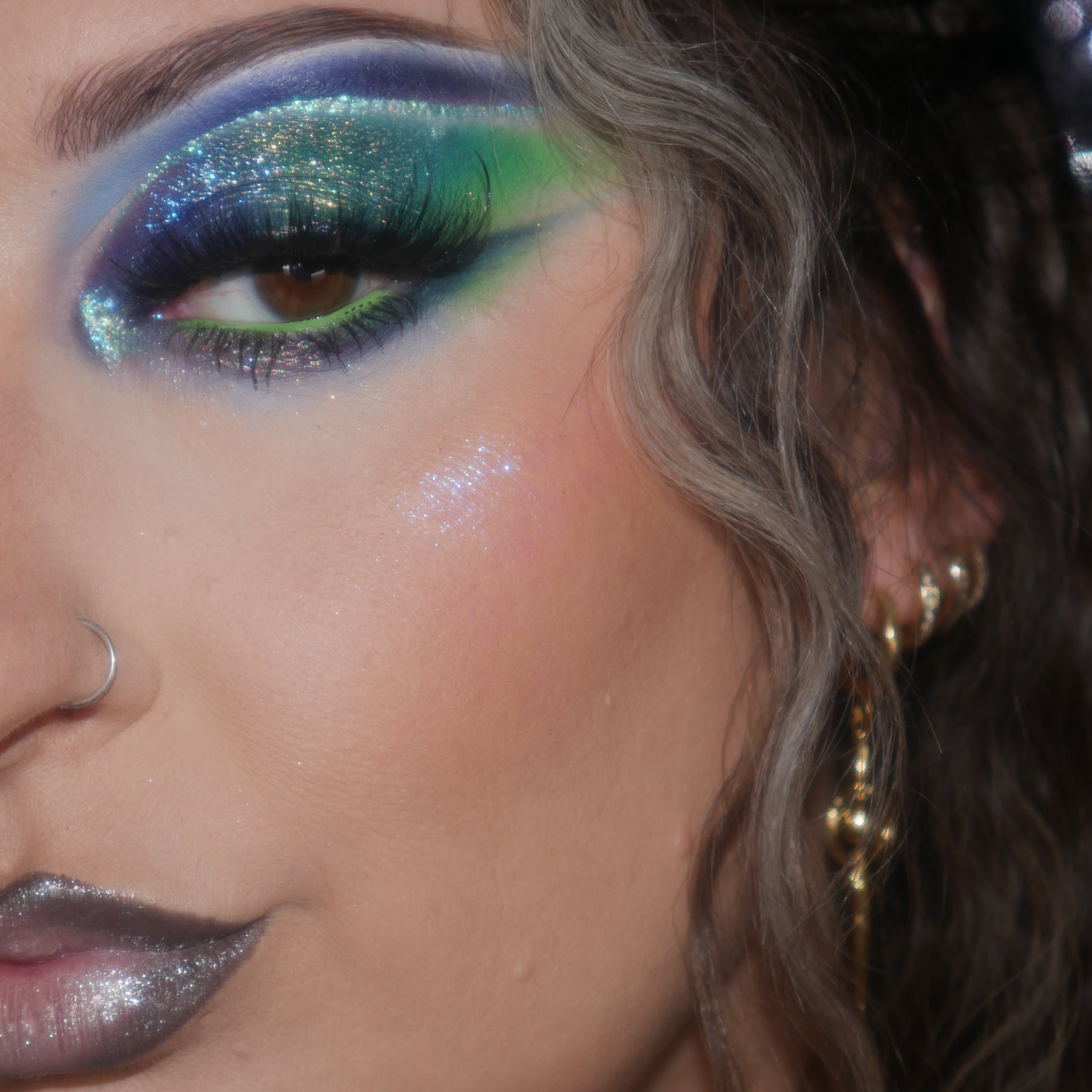 Each shade was carefully curated alongside Ellie Starr to reflect the colors and movement of the northern lights, from deep cosmic teals and moody purples to radiant iridescents and bold multichromes that bring the night sky to your eyes.