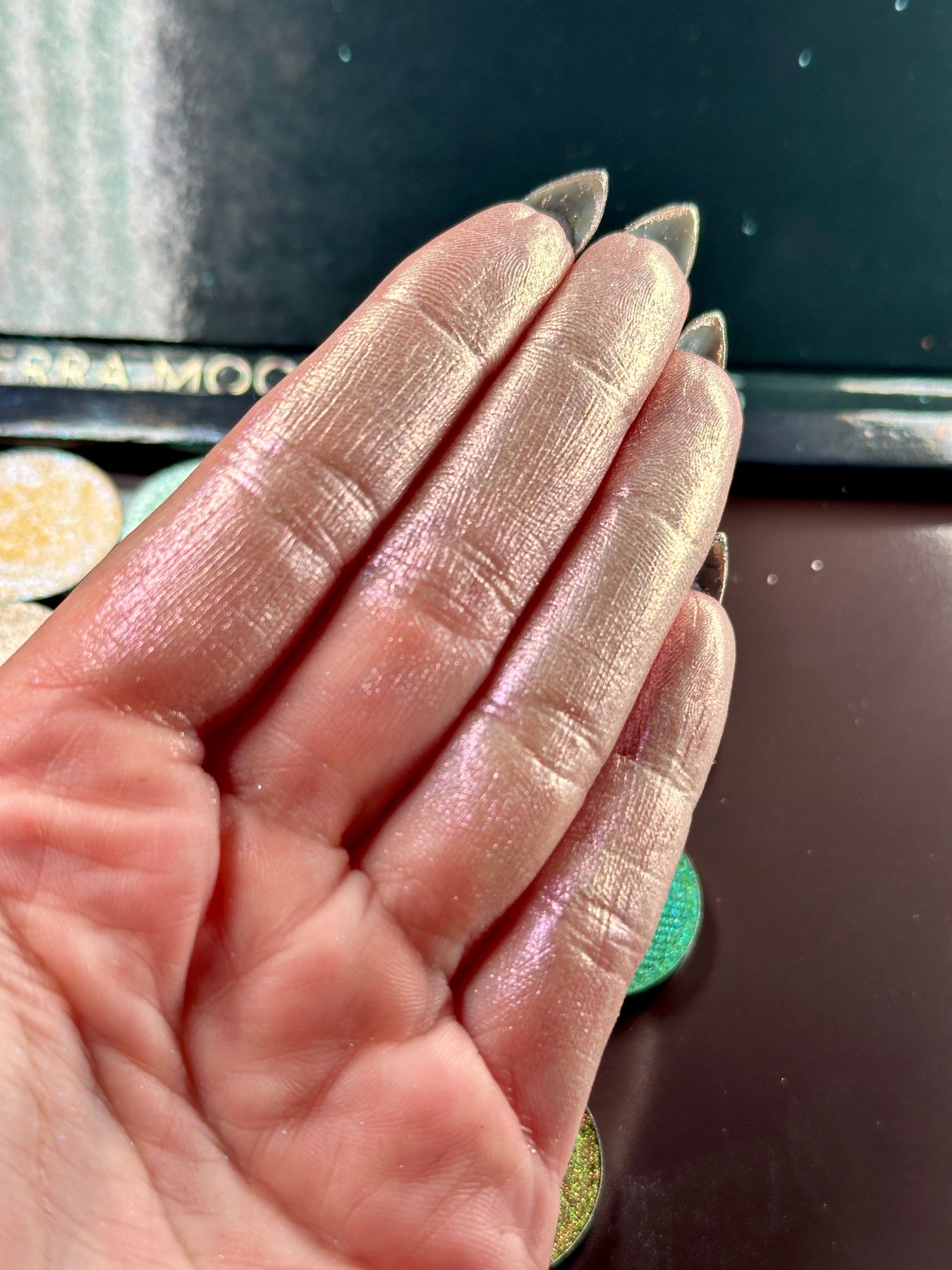 TIPS: Apply with your favorite shadow brushes. Flat and firmer brushes will give the most color payoff. Try using a setting spray to wet your brush, or use a glitter primer for larger particle mica pigments before applying for a more intense finish.