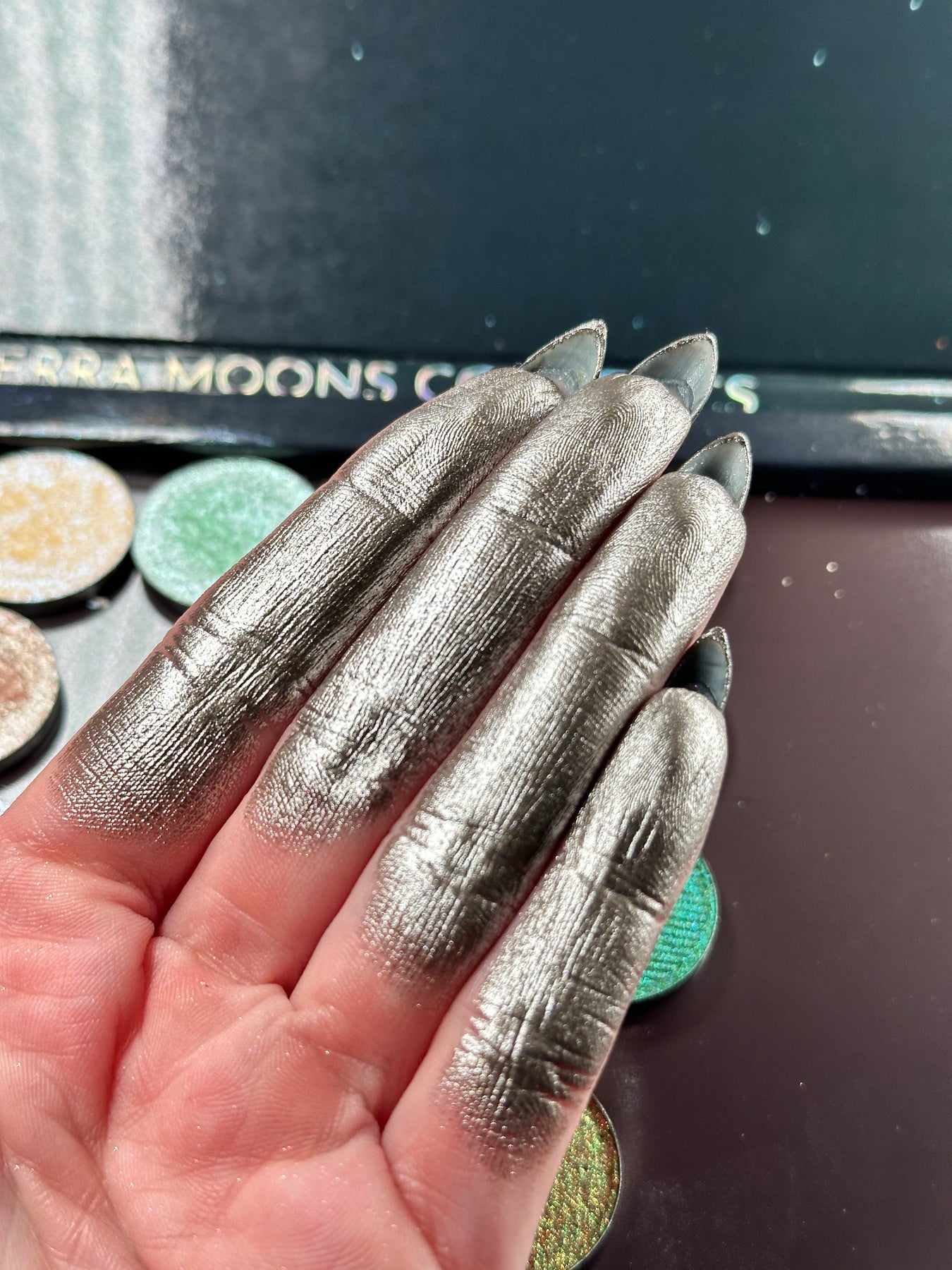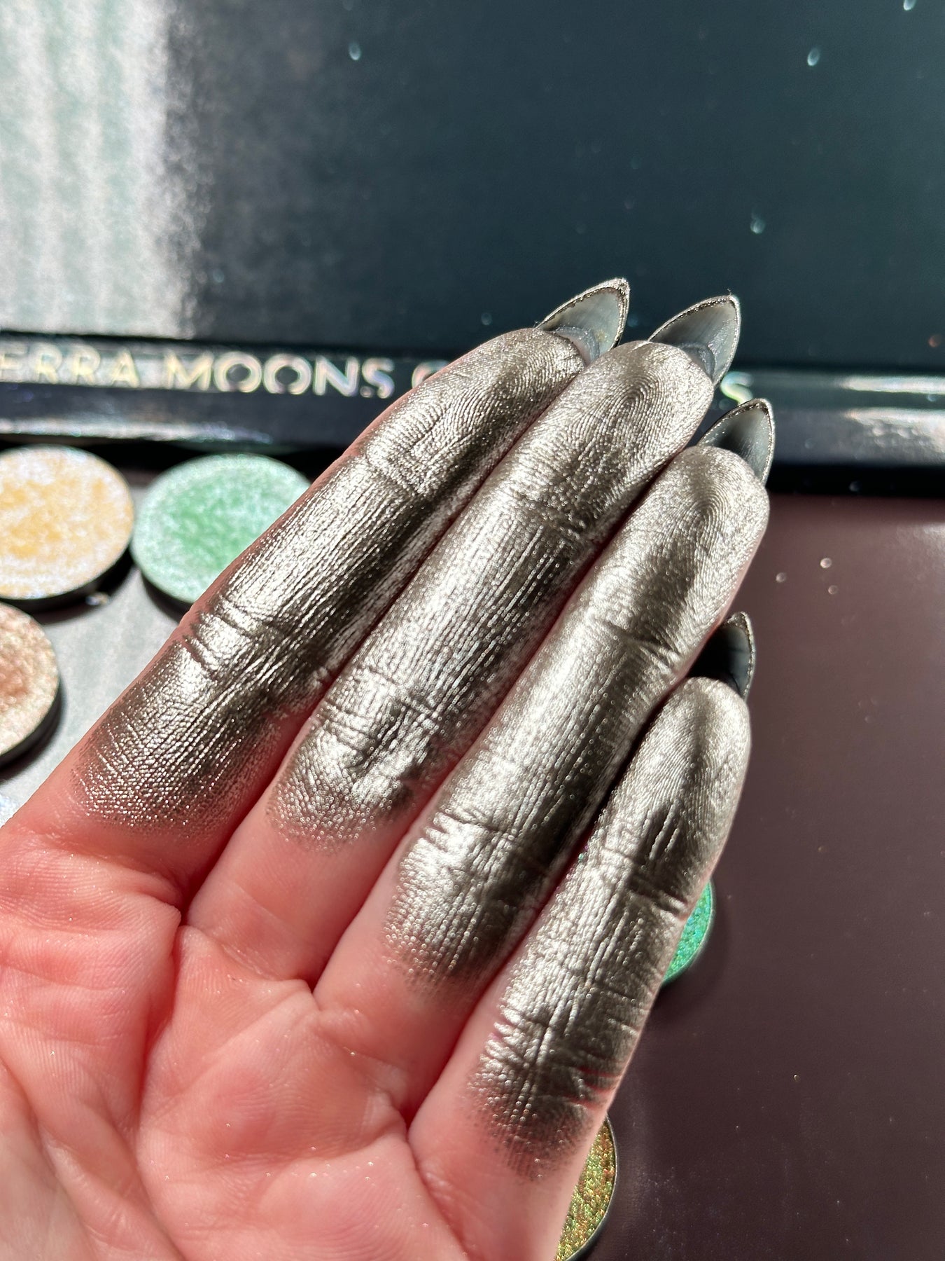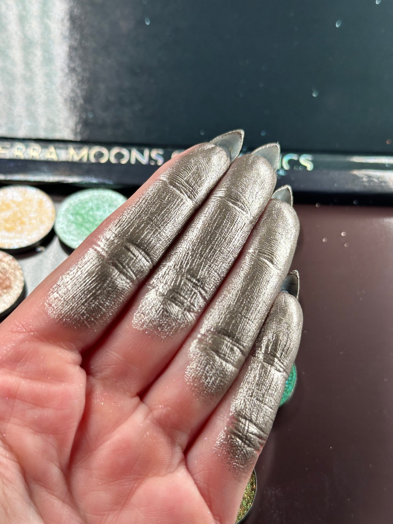 This shadow is best applied with a setting spray or a glitter glue to intensify the metallic finish.