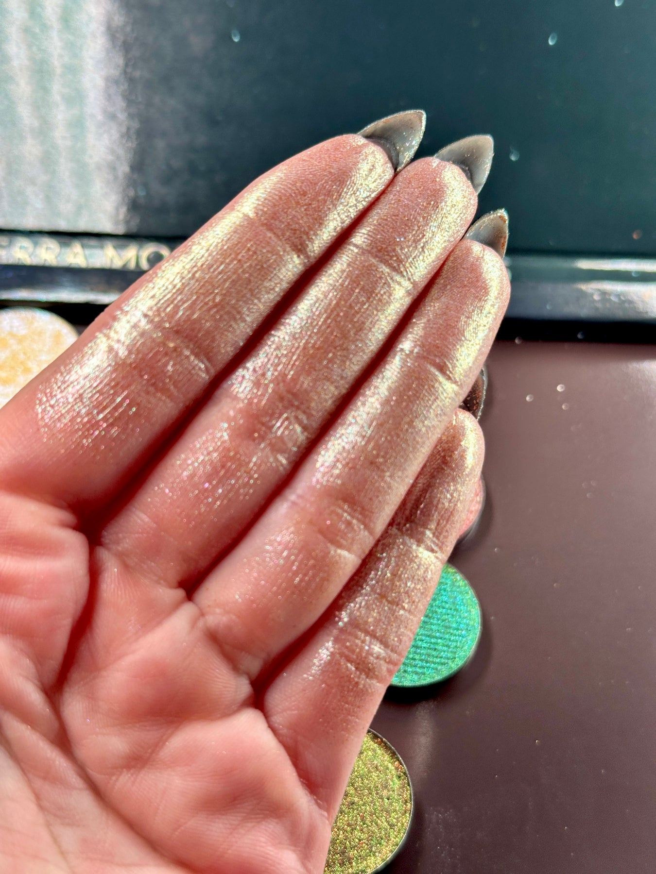 Patina Shield is a duochrome with a soft gold base and lots of blue and pink sparkles.