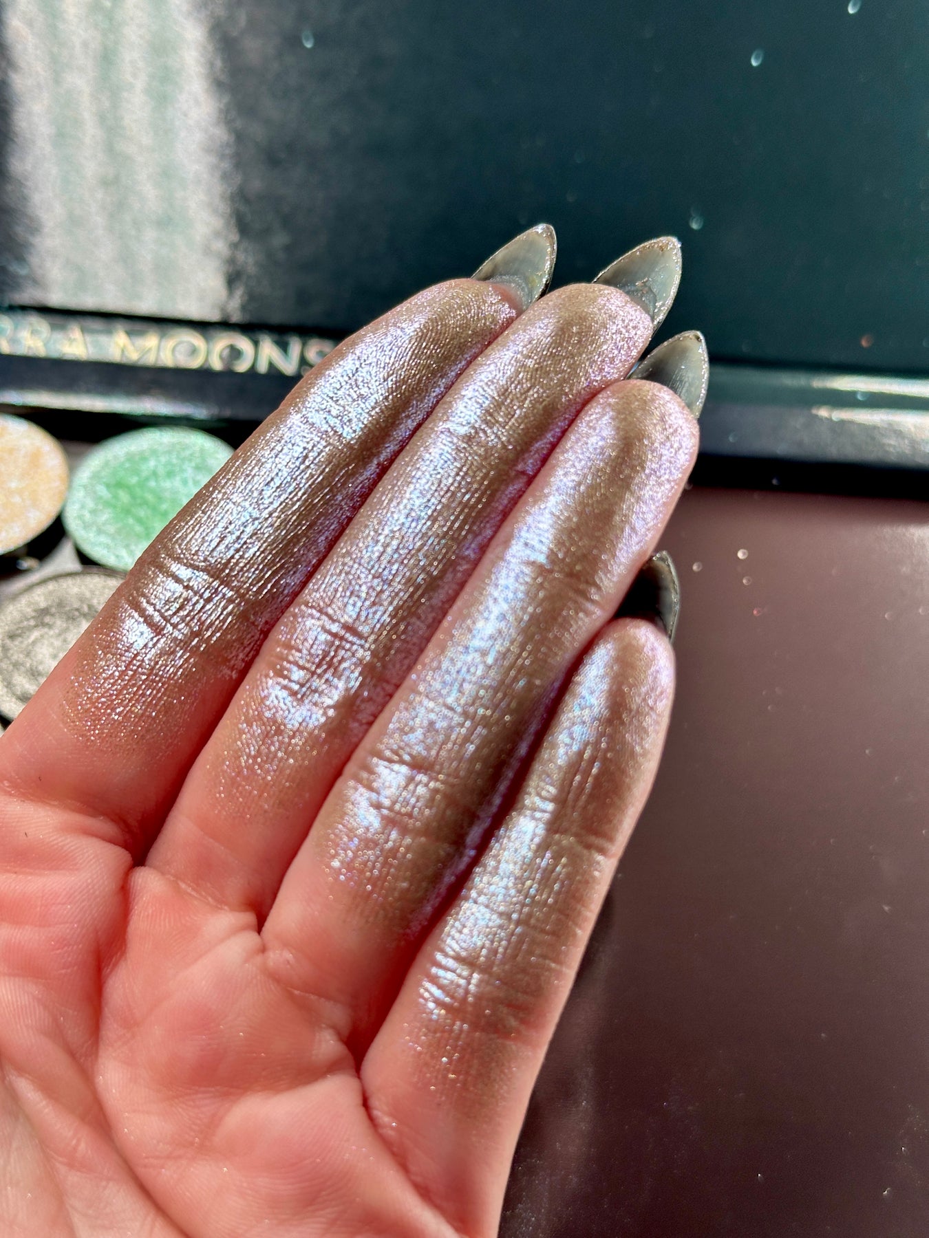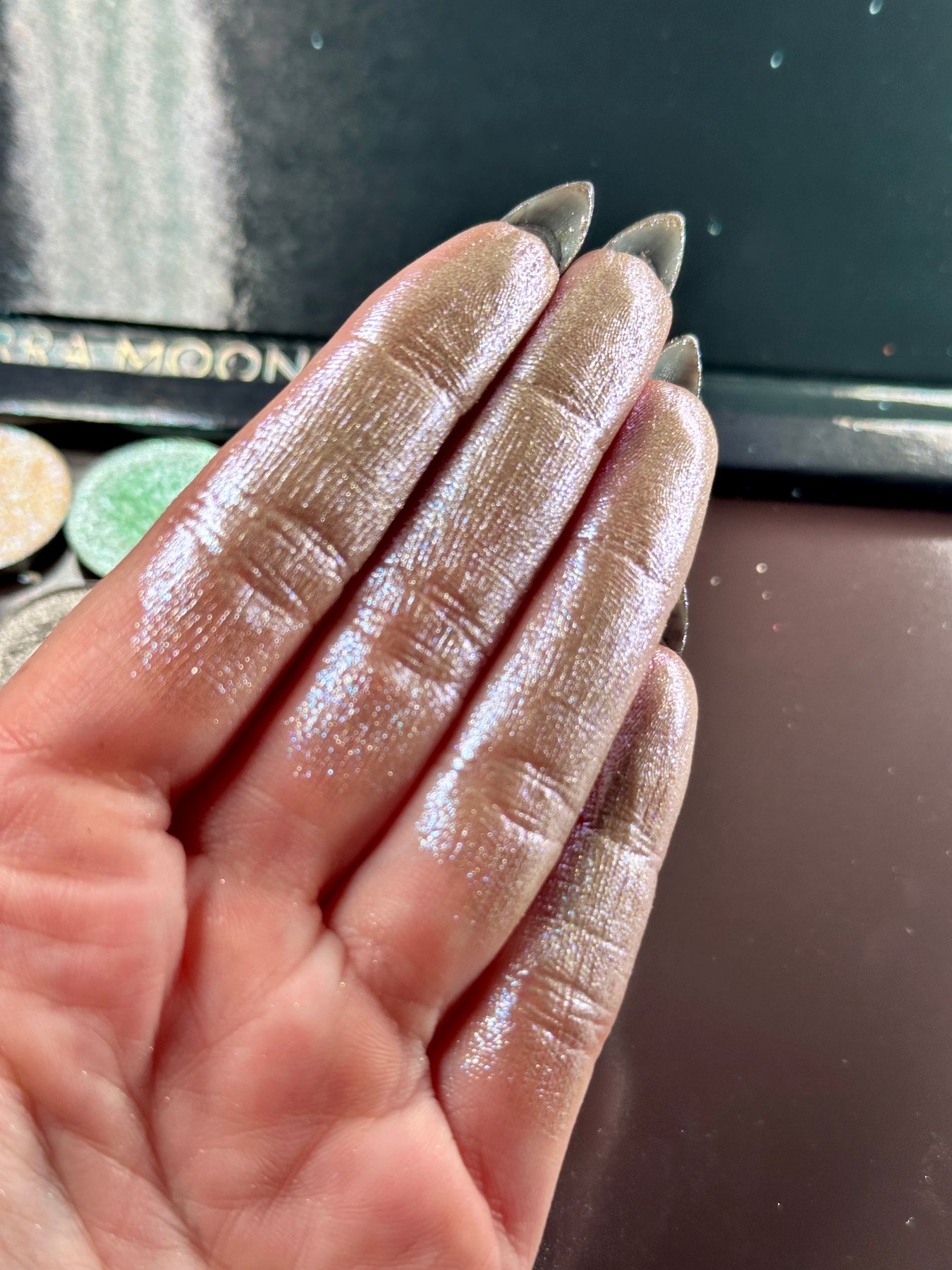 Silver Moon is a soft gold duochrome with pink and blue sparkles.